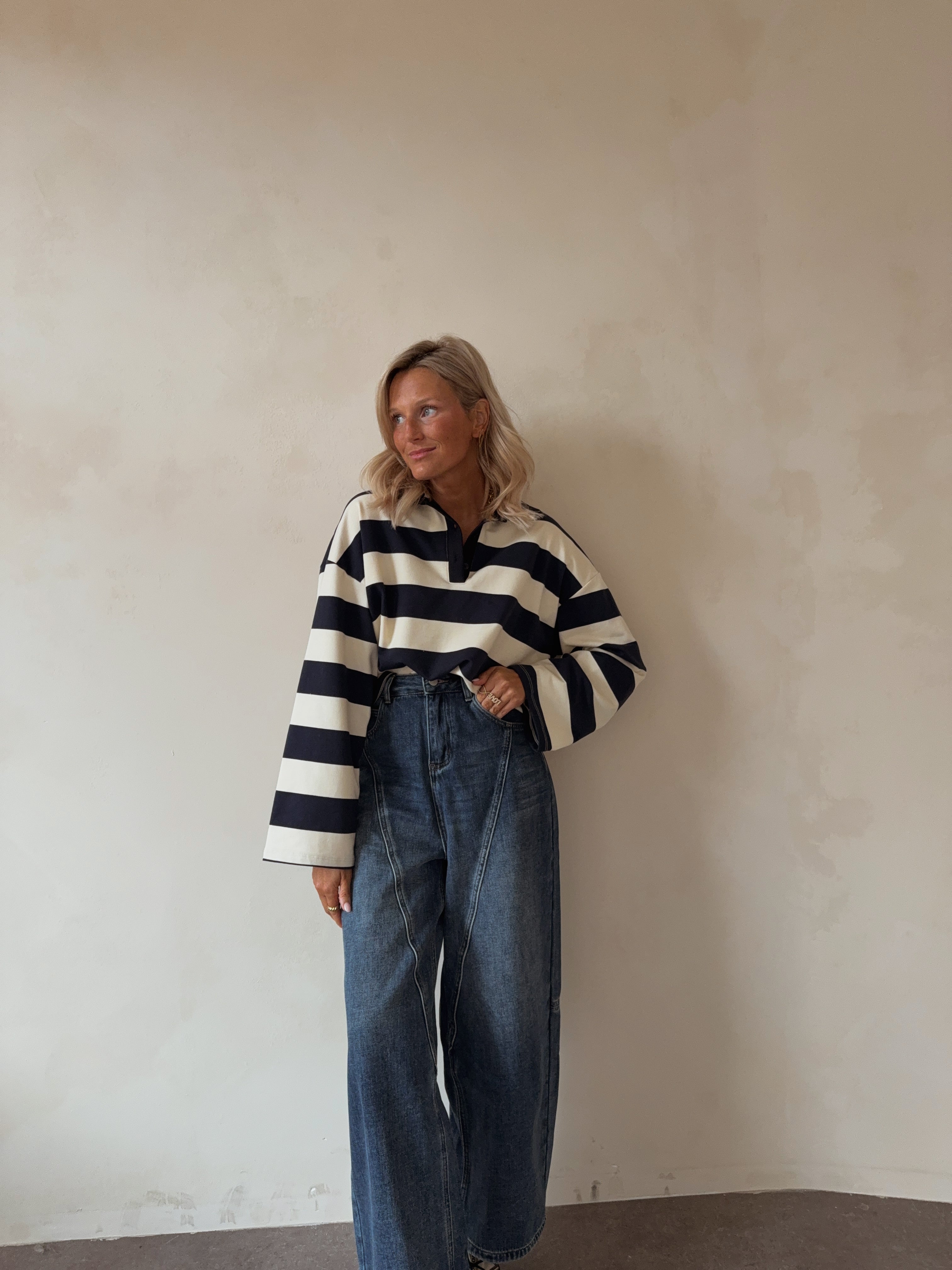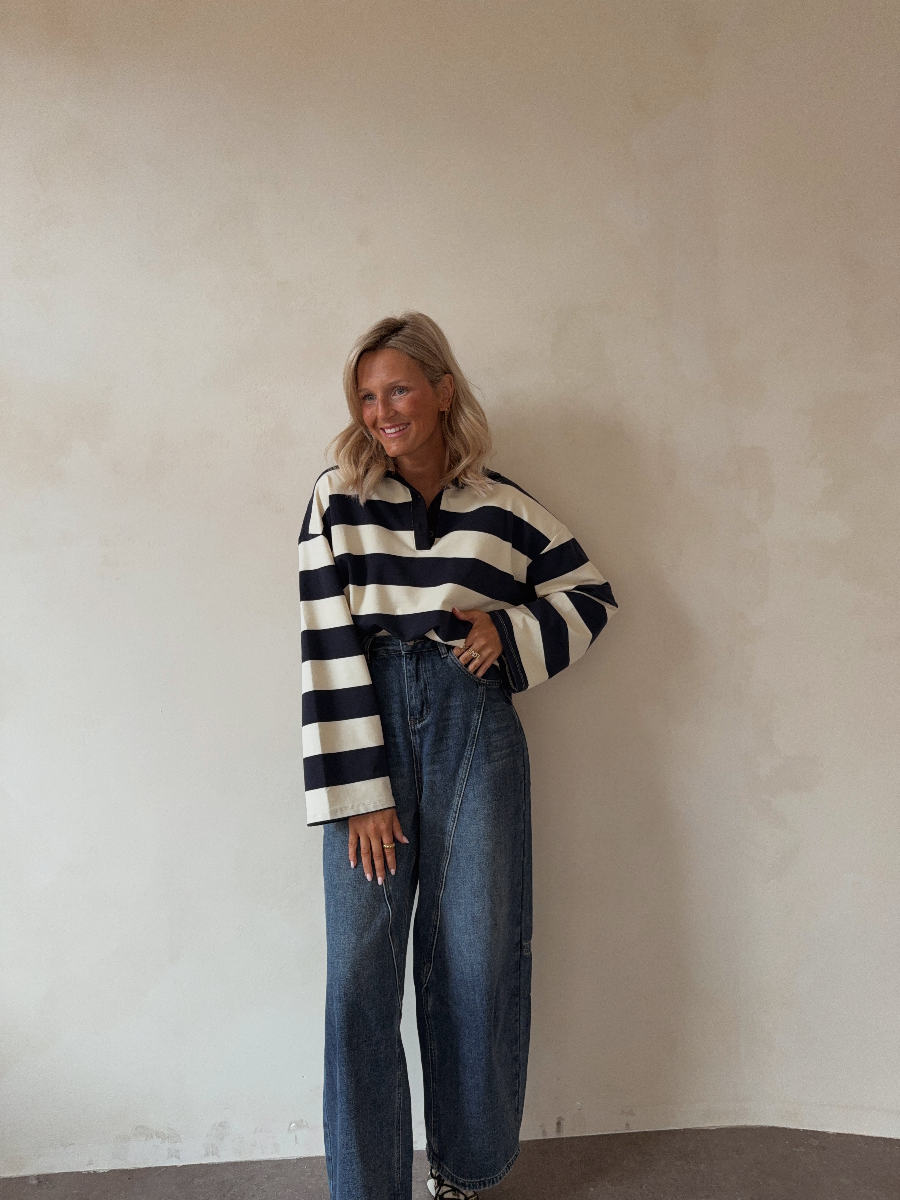 Deze gestreepte pull combineert comfort met een tijdloze, preppy uitstraling. Het ontwerp heeft brede navy- en crèmekleurige strepen, een klassieke polo-kraag met knoopsluiting. De zachte, ademende stof zorgt voor een aangenaam draagcomfort, ideaal voor zowel casual als smart-casual outfits.