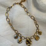 Een elegante statement ketting met een speelse mix van goud- en zilverkleurige schakels, afgewerkt met verschillende organisch gevormde medaillons. Elk detail geeft diepte en karakter aan het ontwerp, waardoor de ketting moeiteloos elke outfit versterkt - van eenvoudig tot uitgesproken chic.