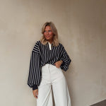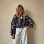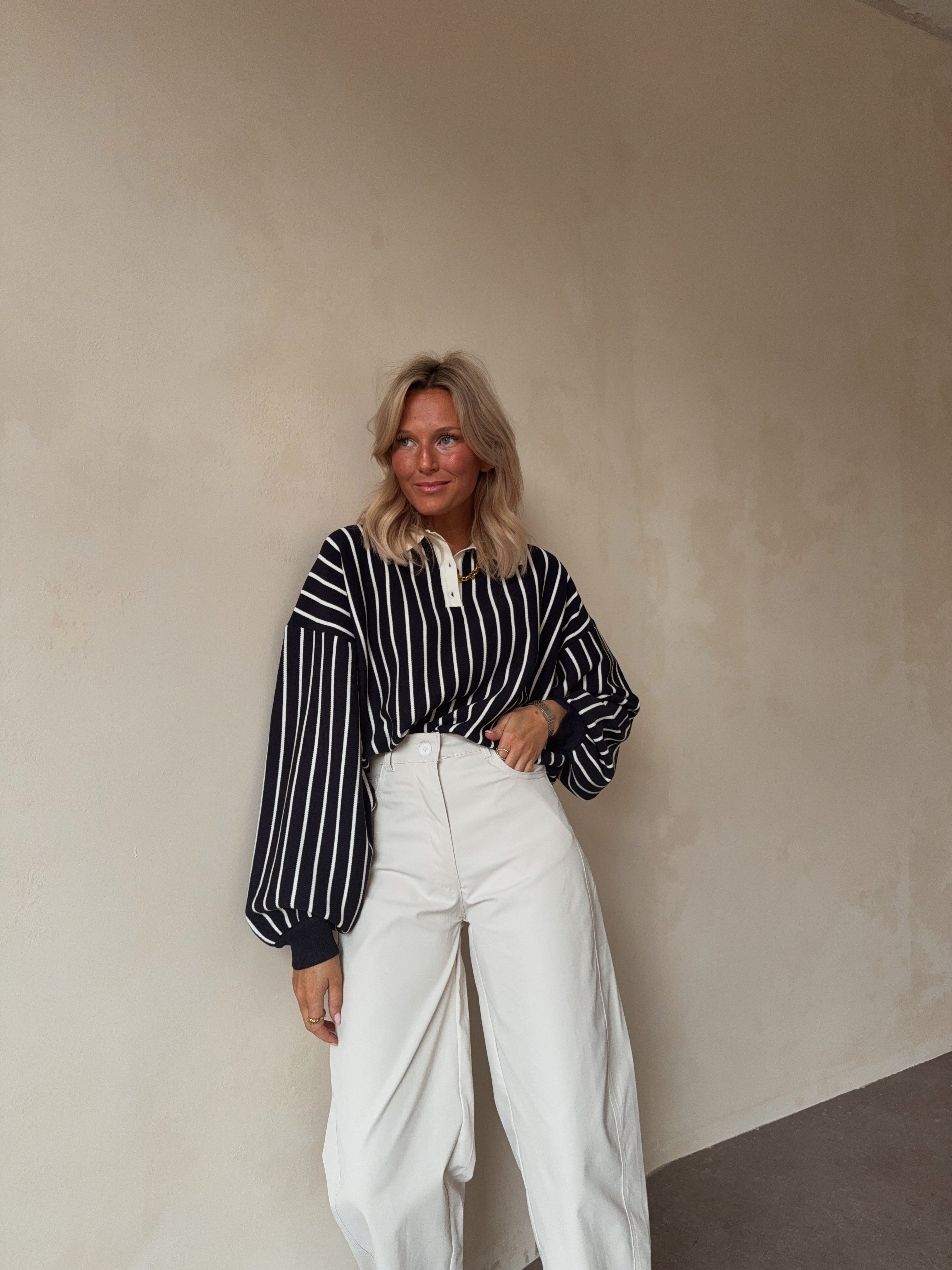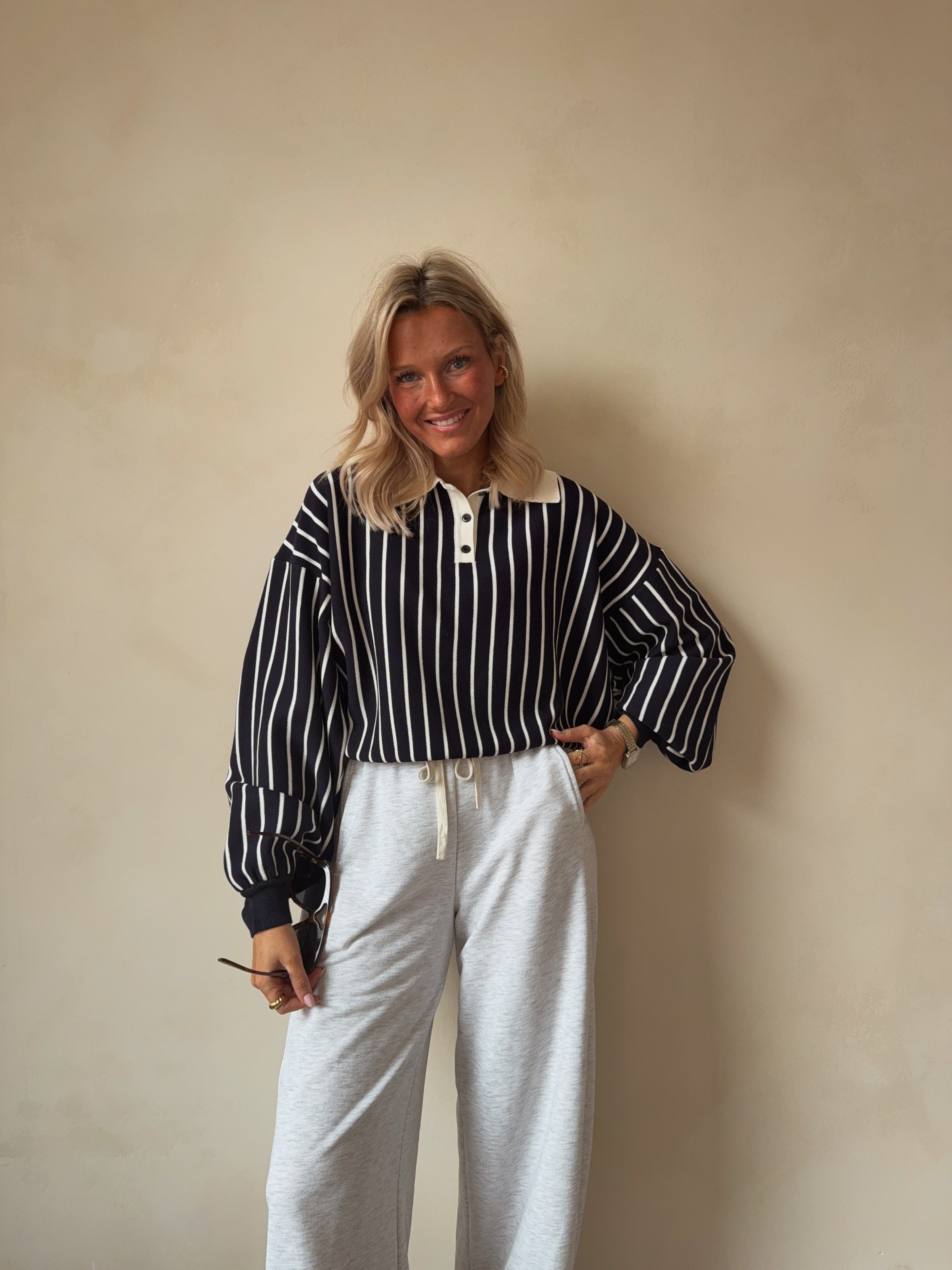 Deze stijlvolle gestreepte pull combineert een sportieve uitstraling met een elegante afwerking. Het ontwerp met verticale strepen zorgt voor een flatterend silhouet, terwijl de polo kraag met knoopjes een moderne en verfijnde touch geeft.