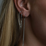 Maud is een verfijnde two-in-one oorbel met een minimalistisch stekertje en een subtiel ringetje, verbonden door een fijn zilverkleurige ketting. Modern, speels en elegant - perfect om je look een unieke, geslaagde touch te geven.