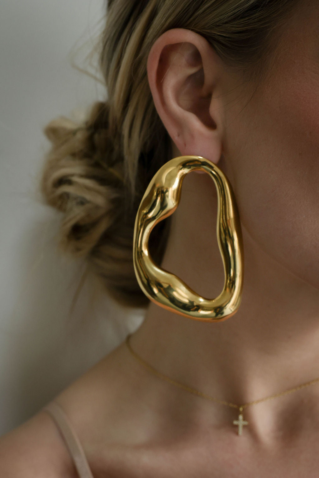 Deze statement hoops hebben een organische, golvende vorm met een hoogglans goudkleurige afwerking. Modern, krachtig en toch verfijnd - de perfecte eyecatcher die elke outfit moeiteloos naar een hoger niveau tilt.