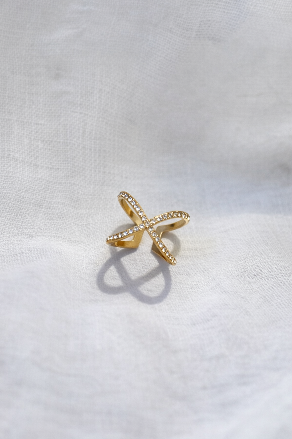 Ring Anaïs heeft een elegant, open ontwerp met gekruiste lijnen en subtiele steentjes. Minimalistisch maar opvallend, perfect om solo te dragen of te combineren met andere ringen. Een tijdloze eyecatcher voor elke dag.