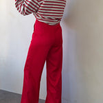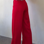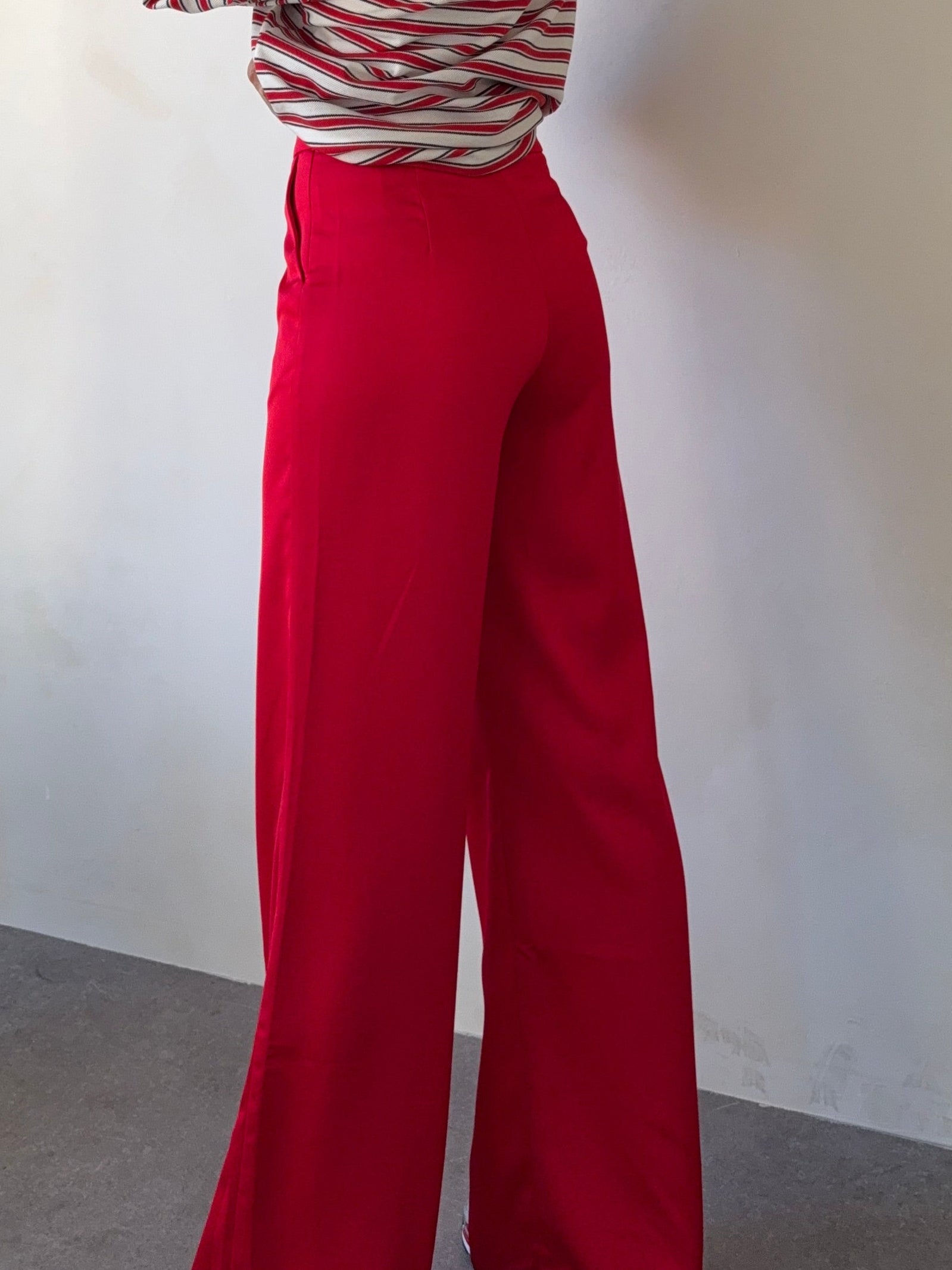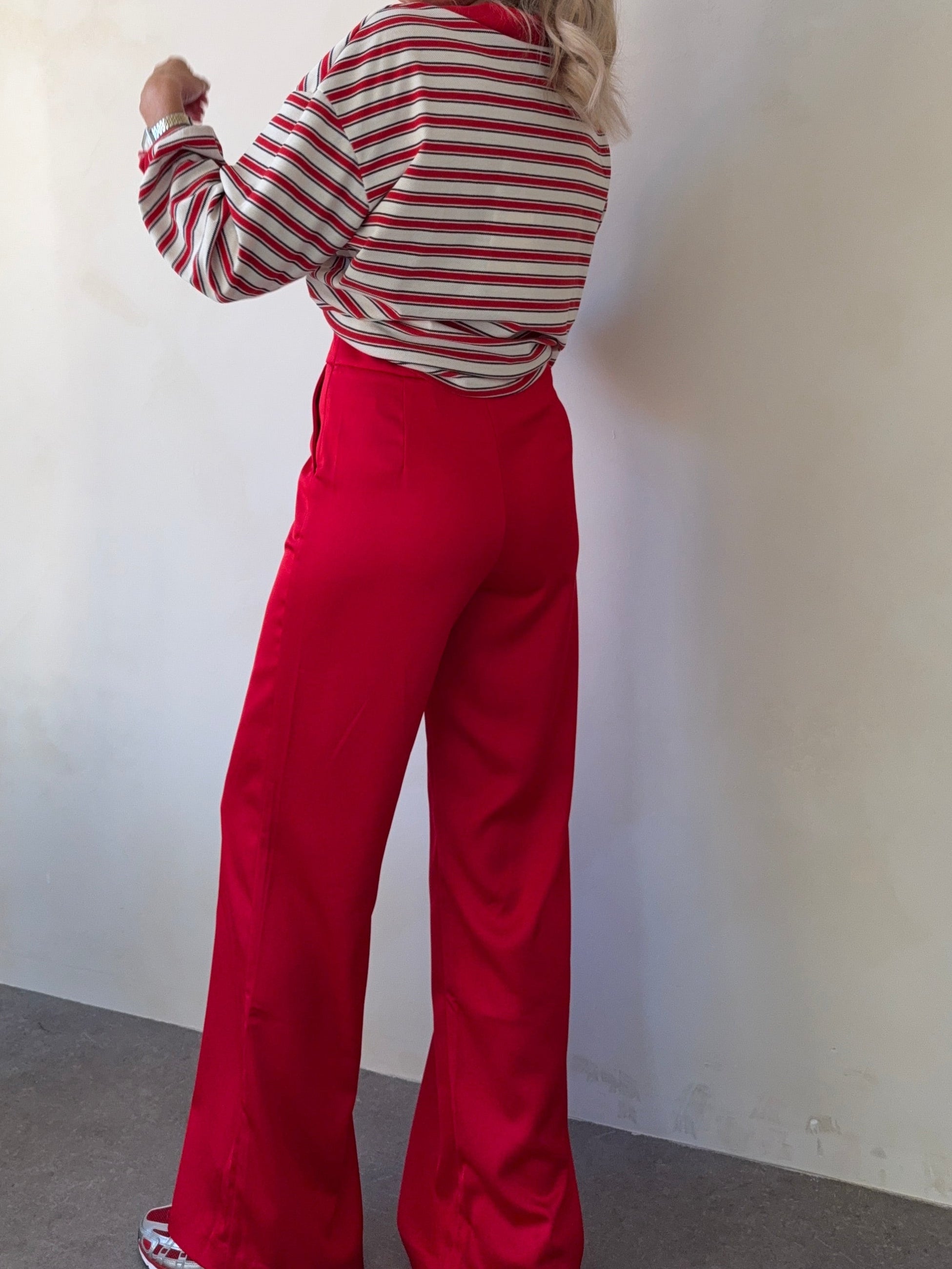 Deze statement broek in een krachtige rode tint combineert elegantie met comfort. De hoge taille zorgt voor een flatterend silhouet, terwijl de wijde pijpen een mooi, vloeiend effect creëren bij elke beweging.