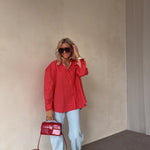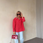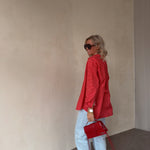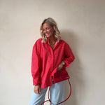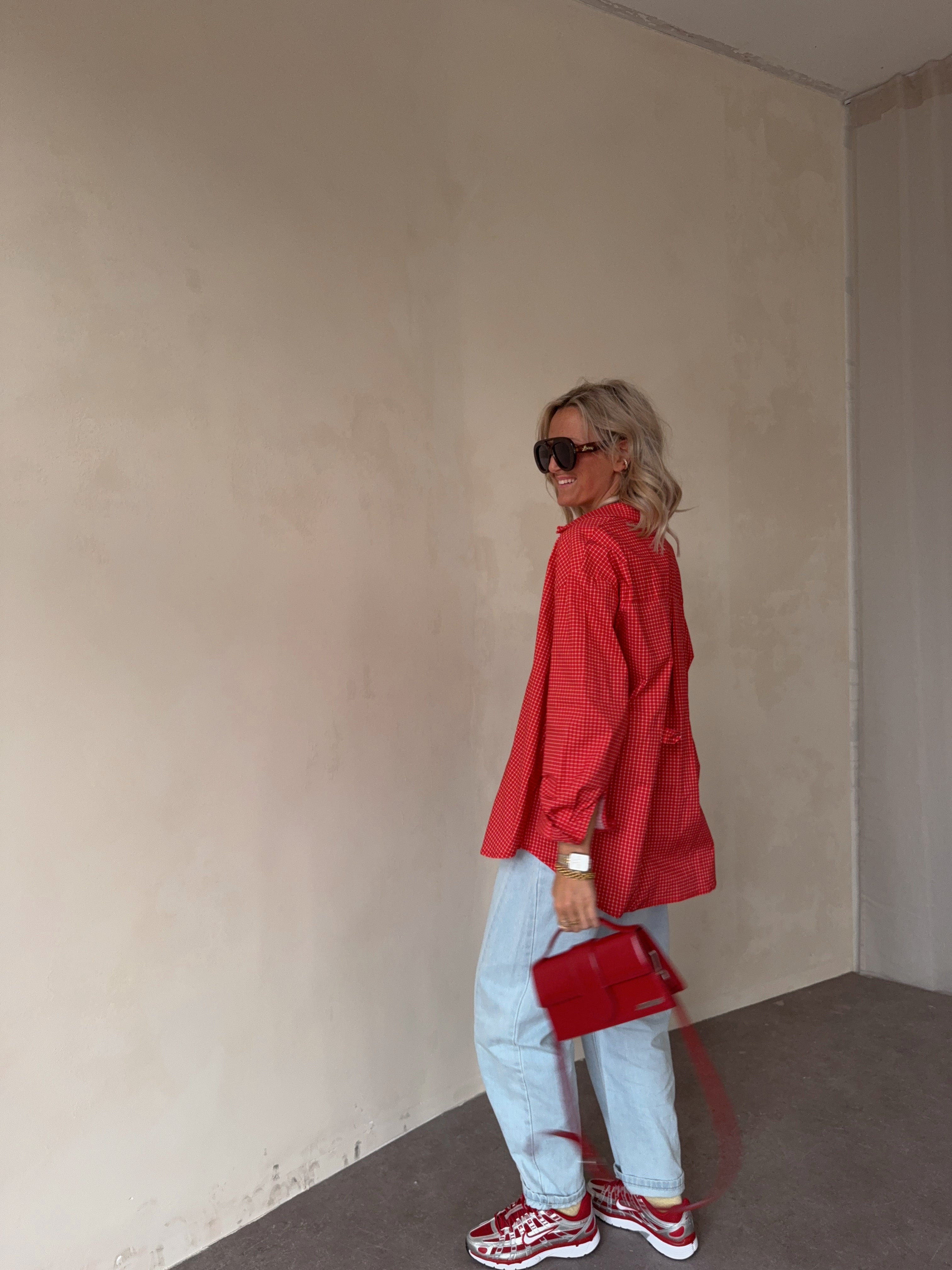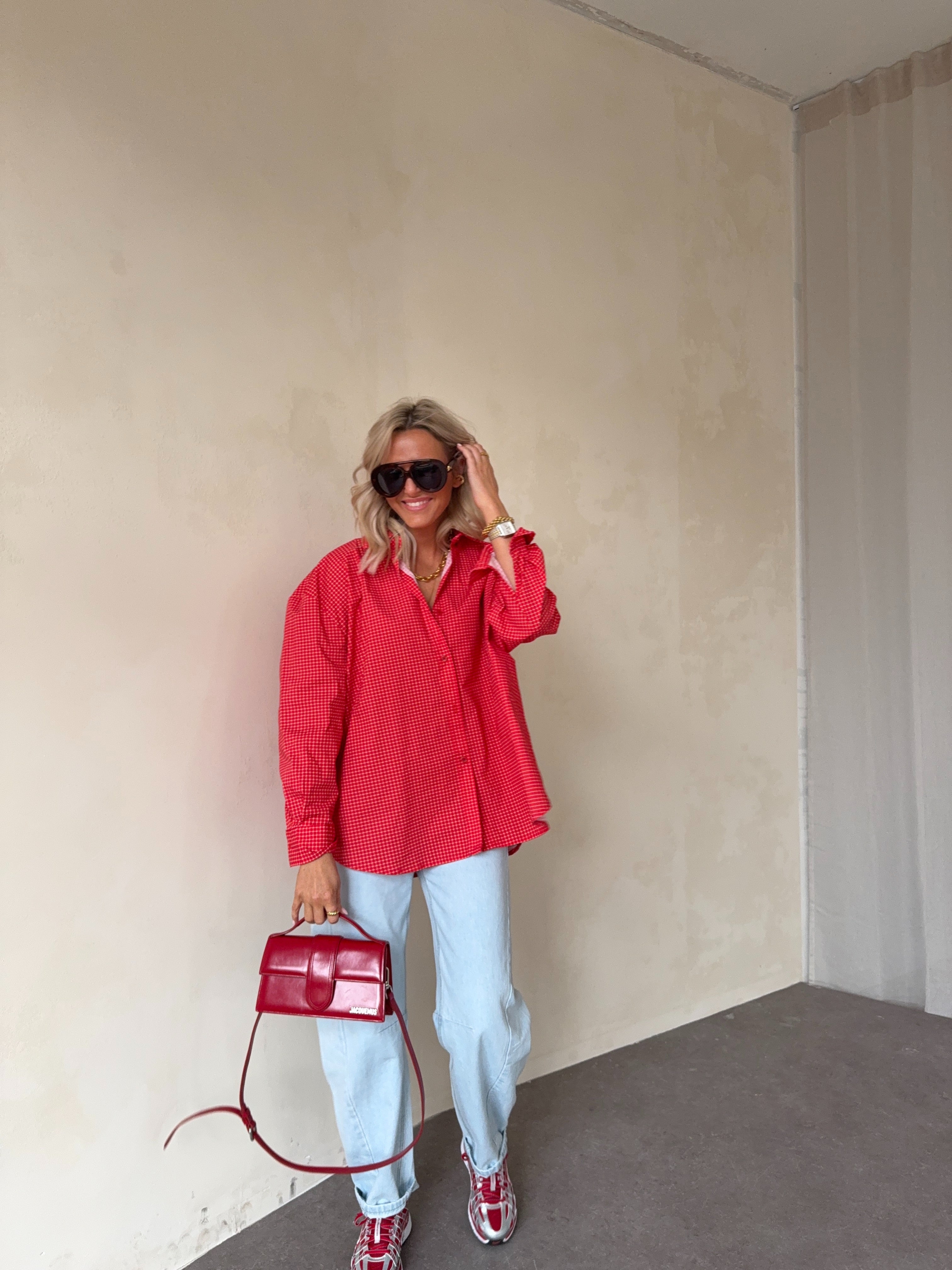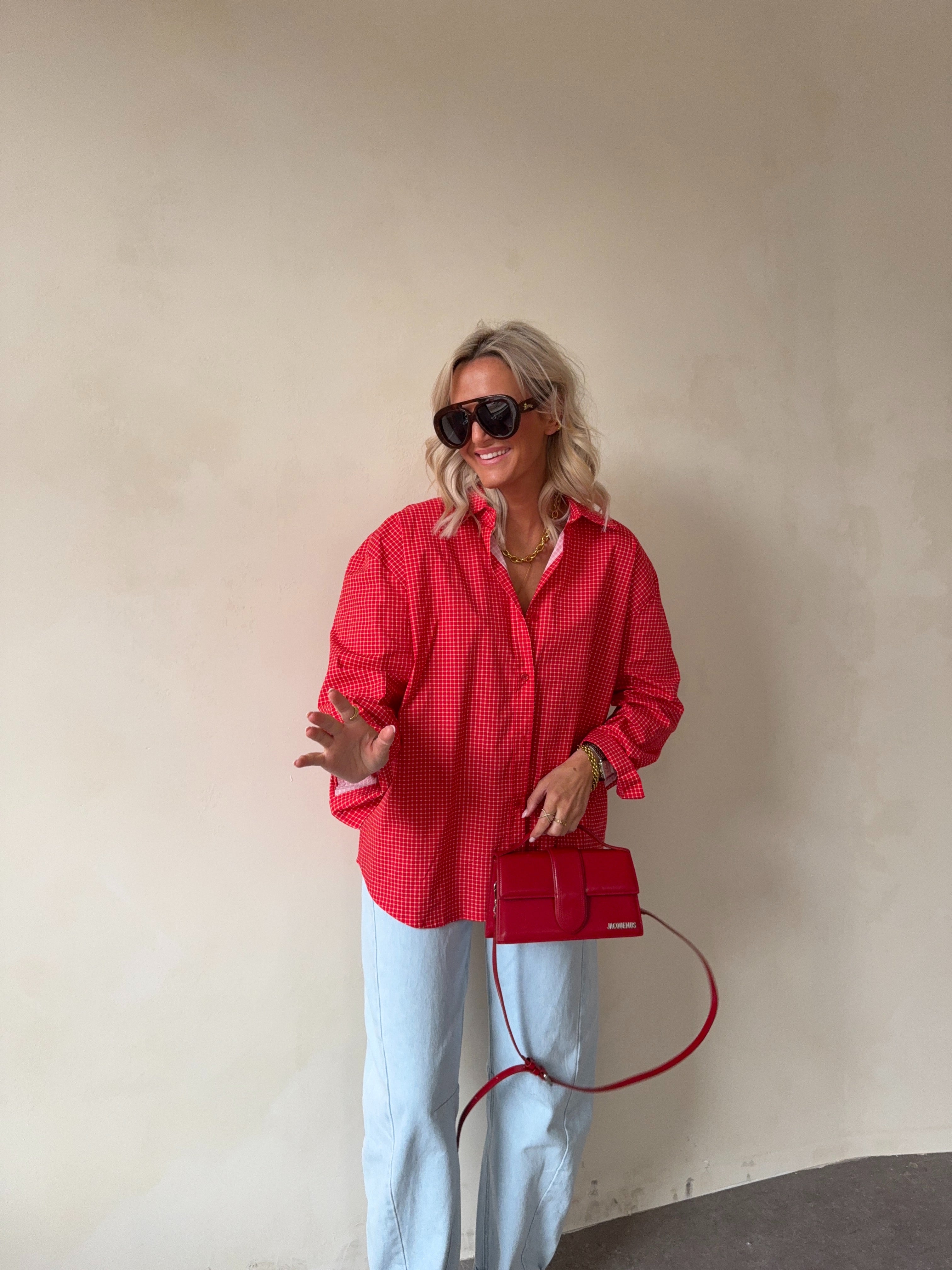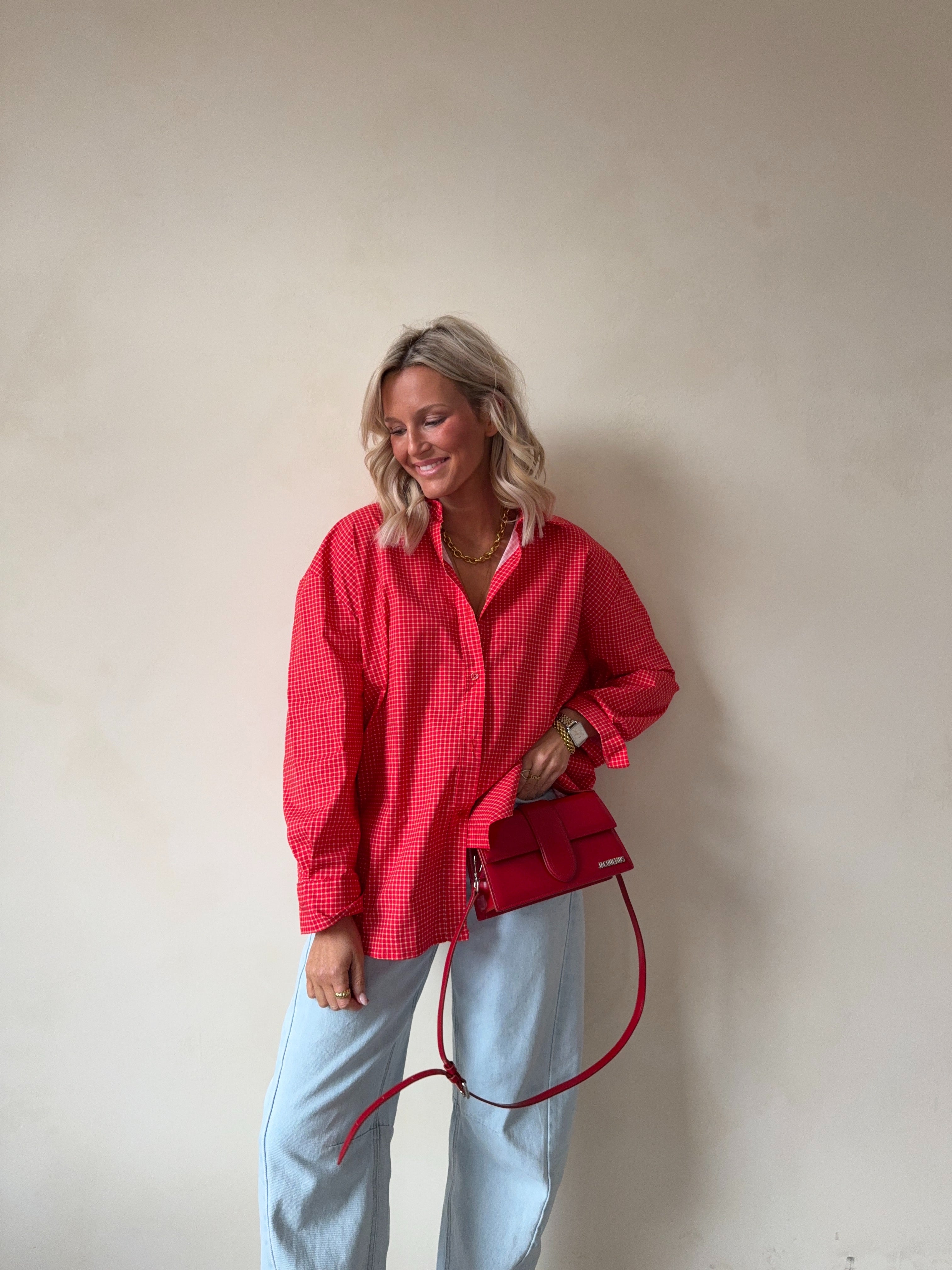 Stijlvolle rode blouse met fijn ruitpatroon en klassieke kraag. Licht, comfortabel en perfect voor een frisse, moderne look.
