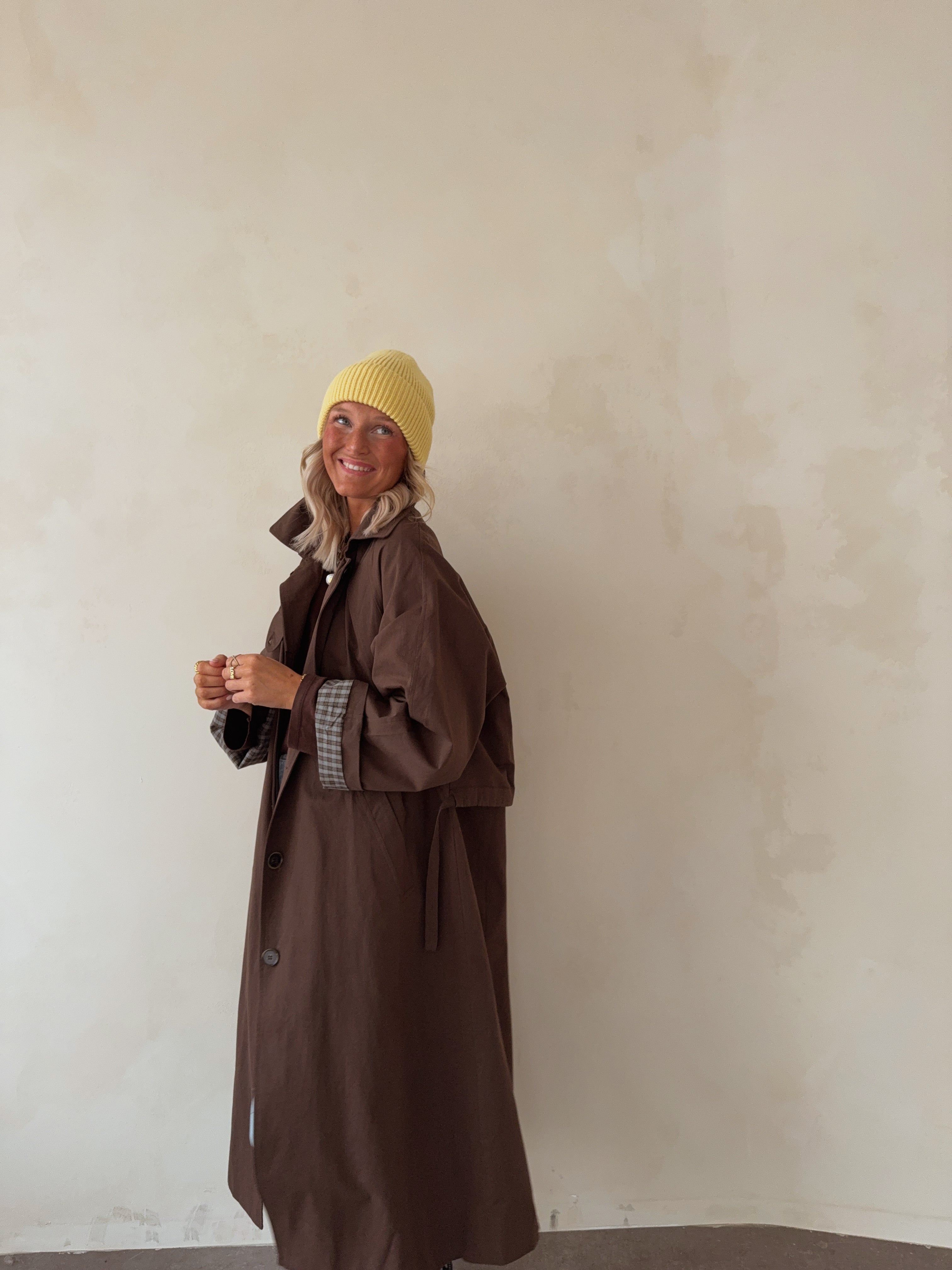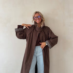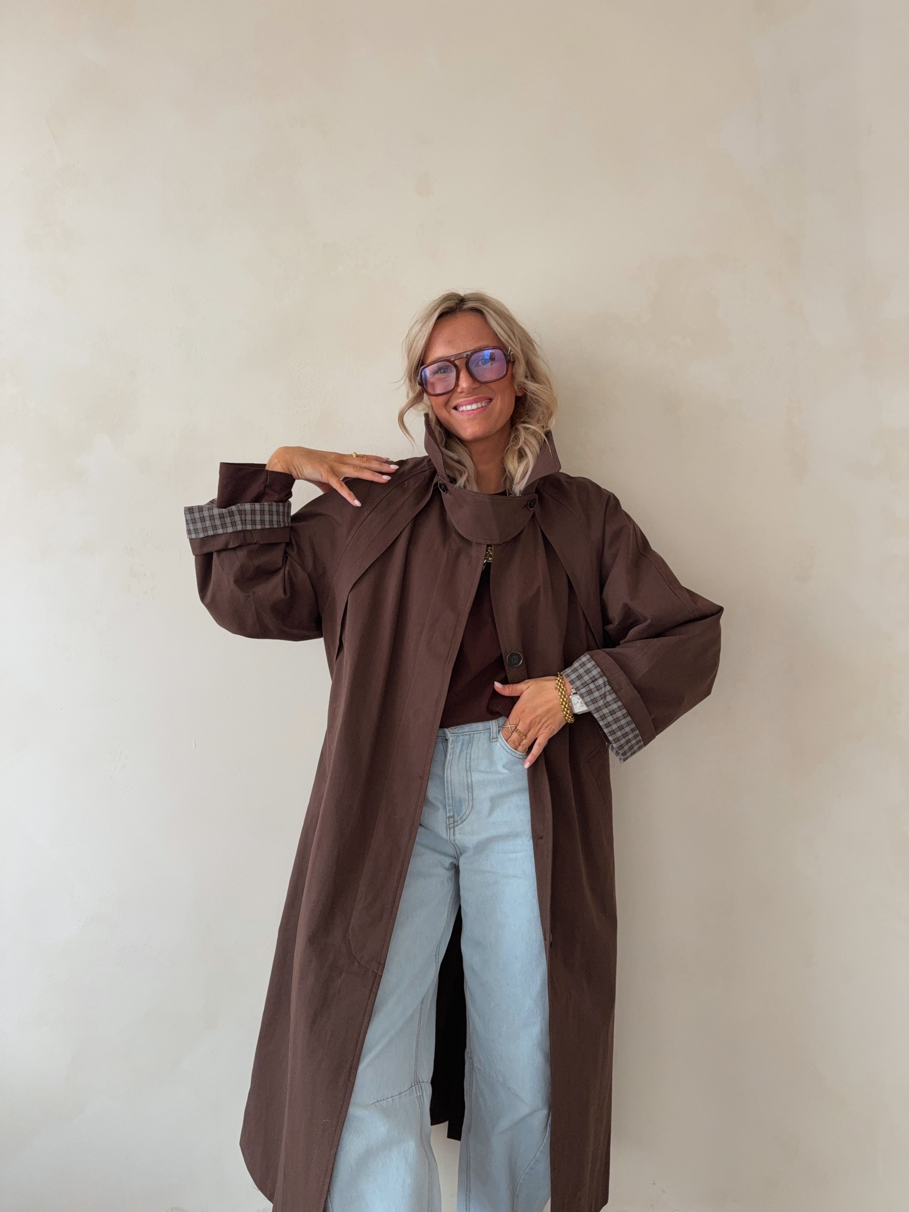 Deze oversized trenchcoat in warme bruintint biedt een stijlvolle en tijdloze uitstraling. De lange lengte, hoge kraag en contrasterende manchetten zorgen voor een modern en verfijnd silhouet. Lichtgewicht en comfortabel, ideaal voor zowel casual als geklede looks.