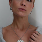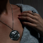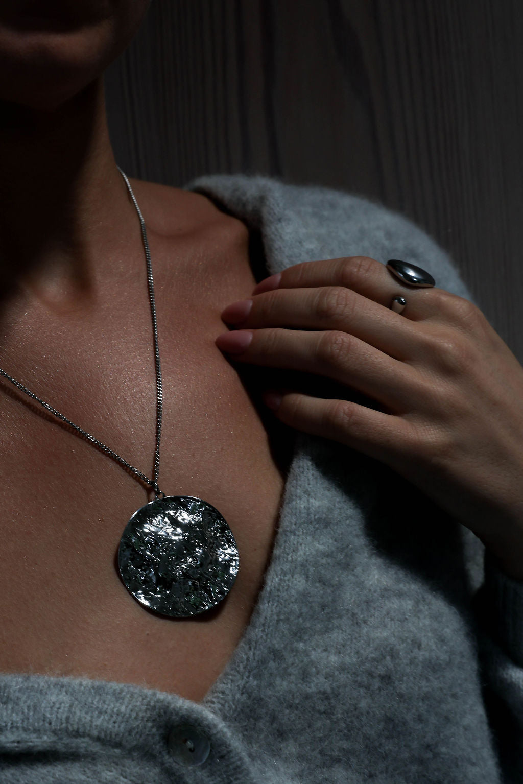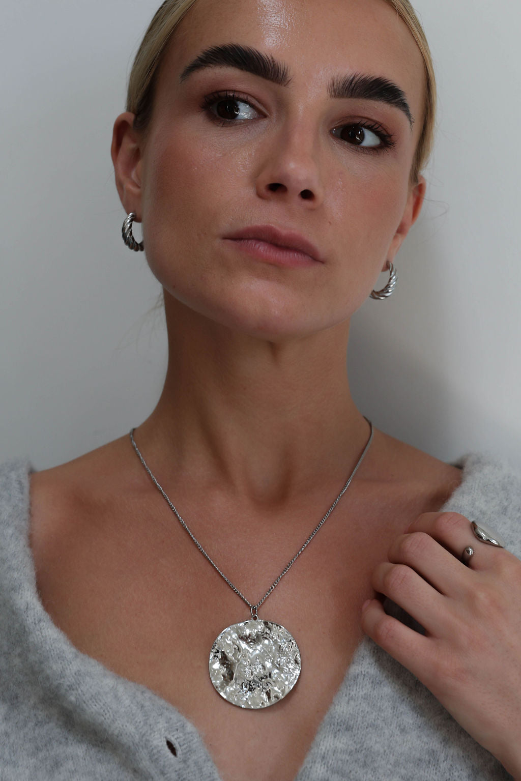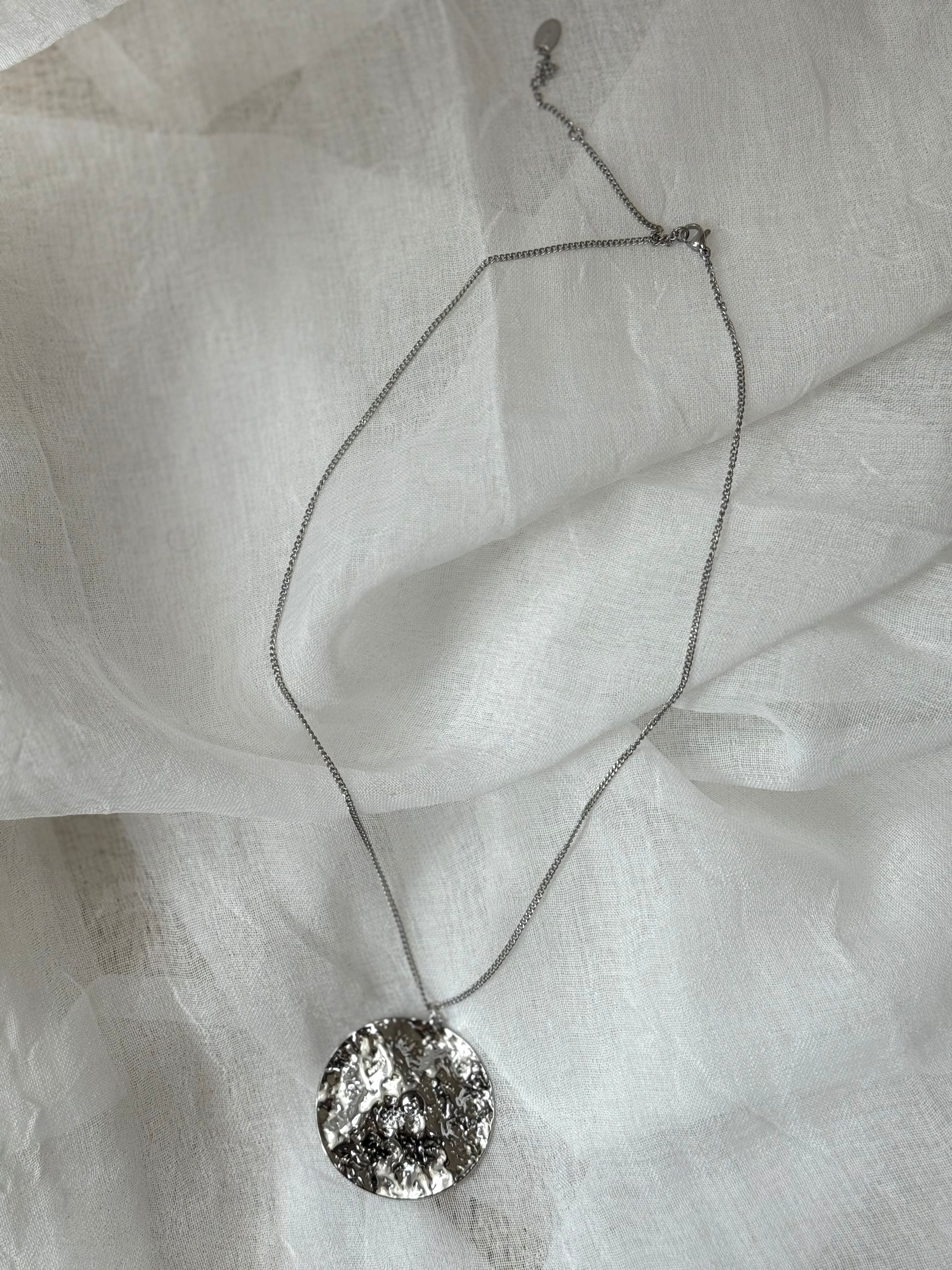voeg een vleugje karakter toe aan je look met deze verfijnde ketting. De hanger in een organisch gevormde ronde schijf straalt eenvoud en elegantie uit, met een ruwe, gesmolten textuur die doet denken aan natuurlijke elementen.
