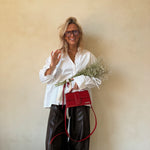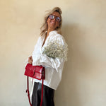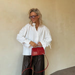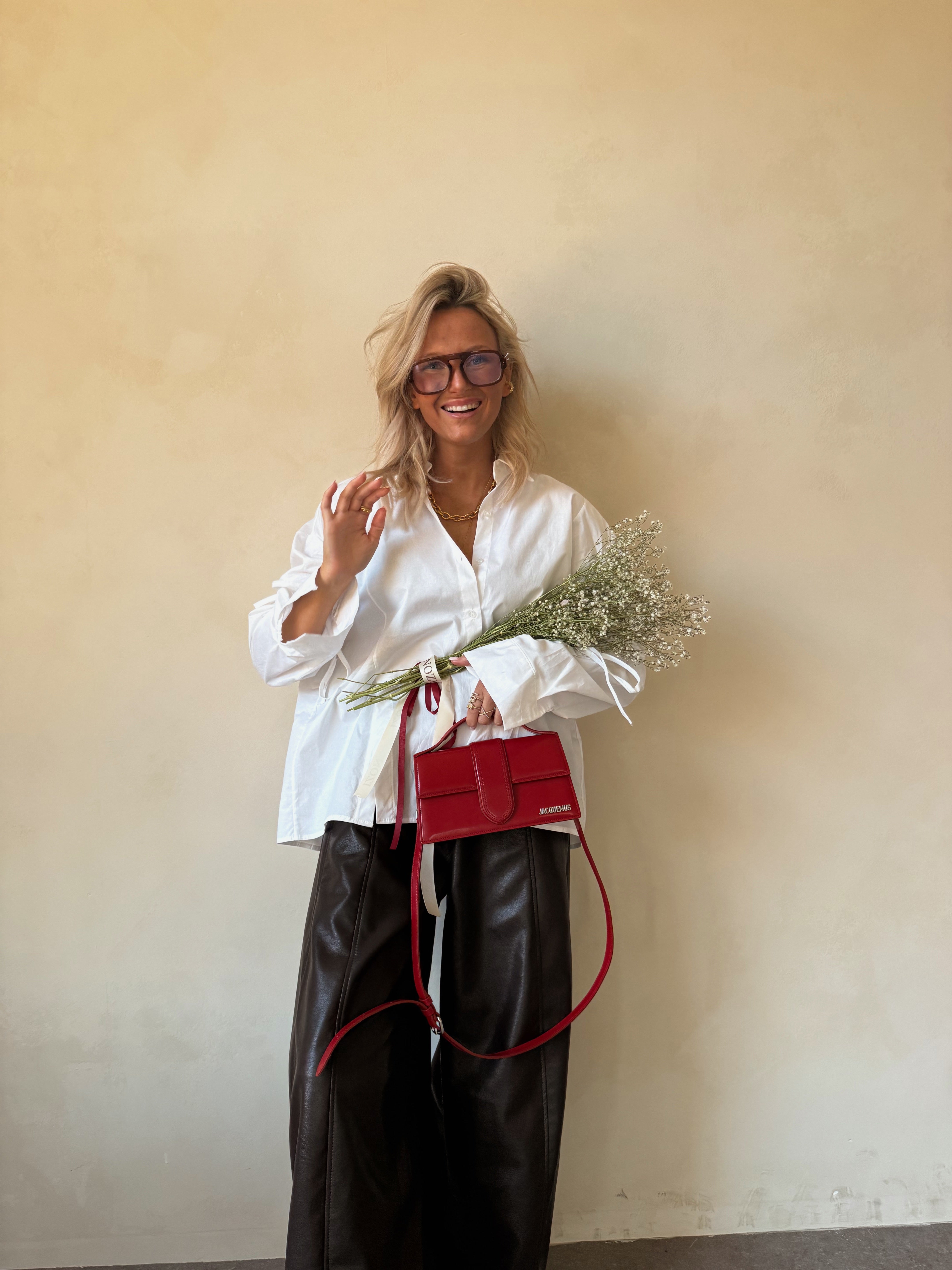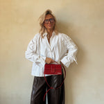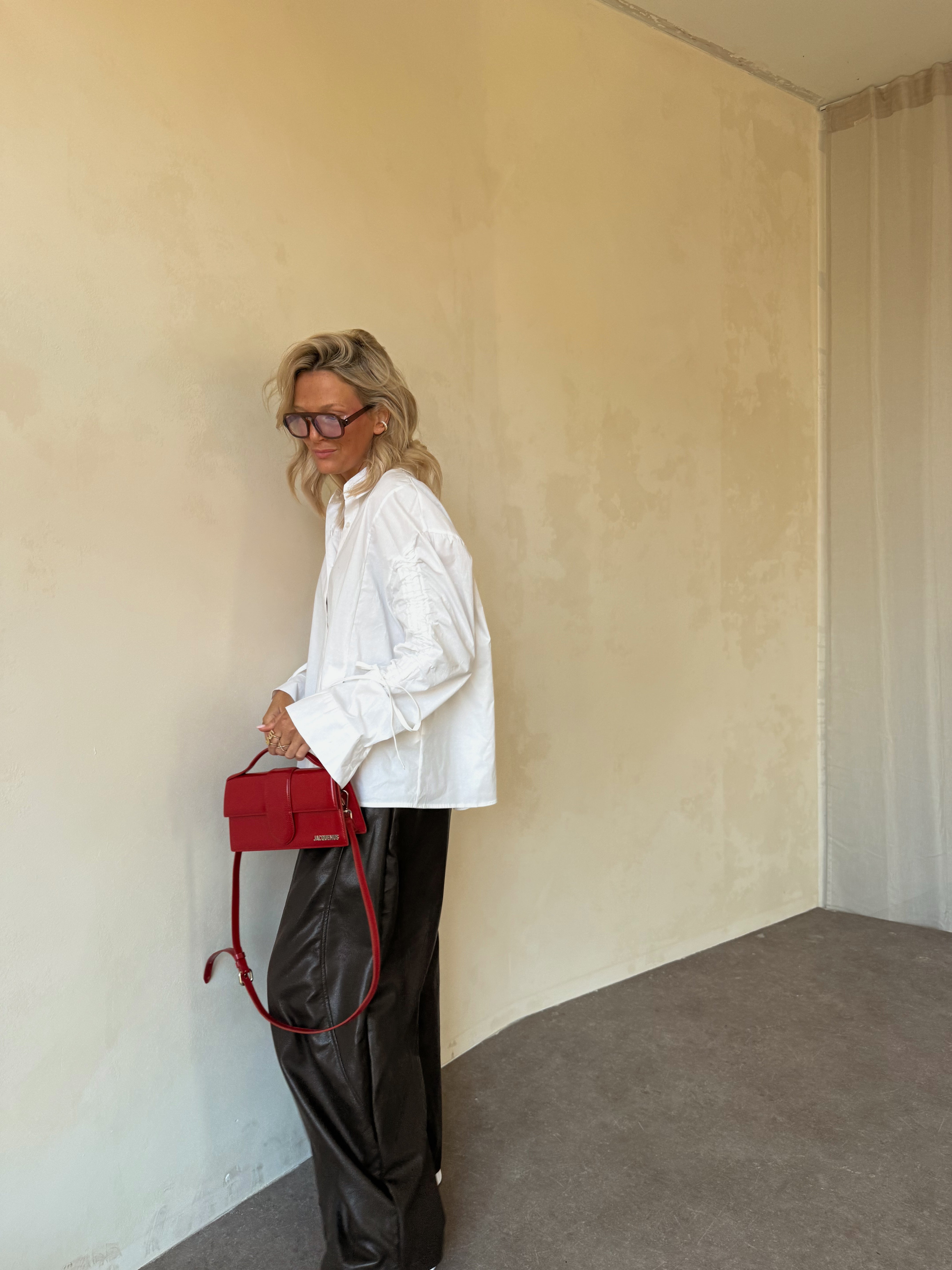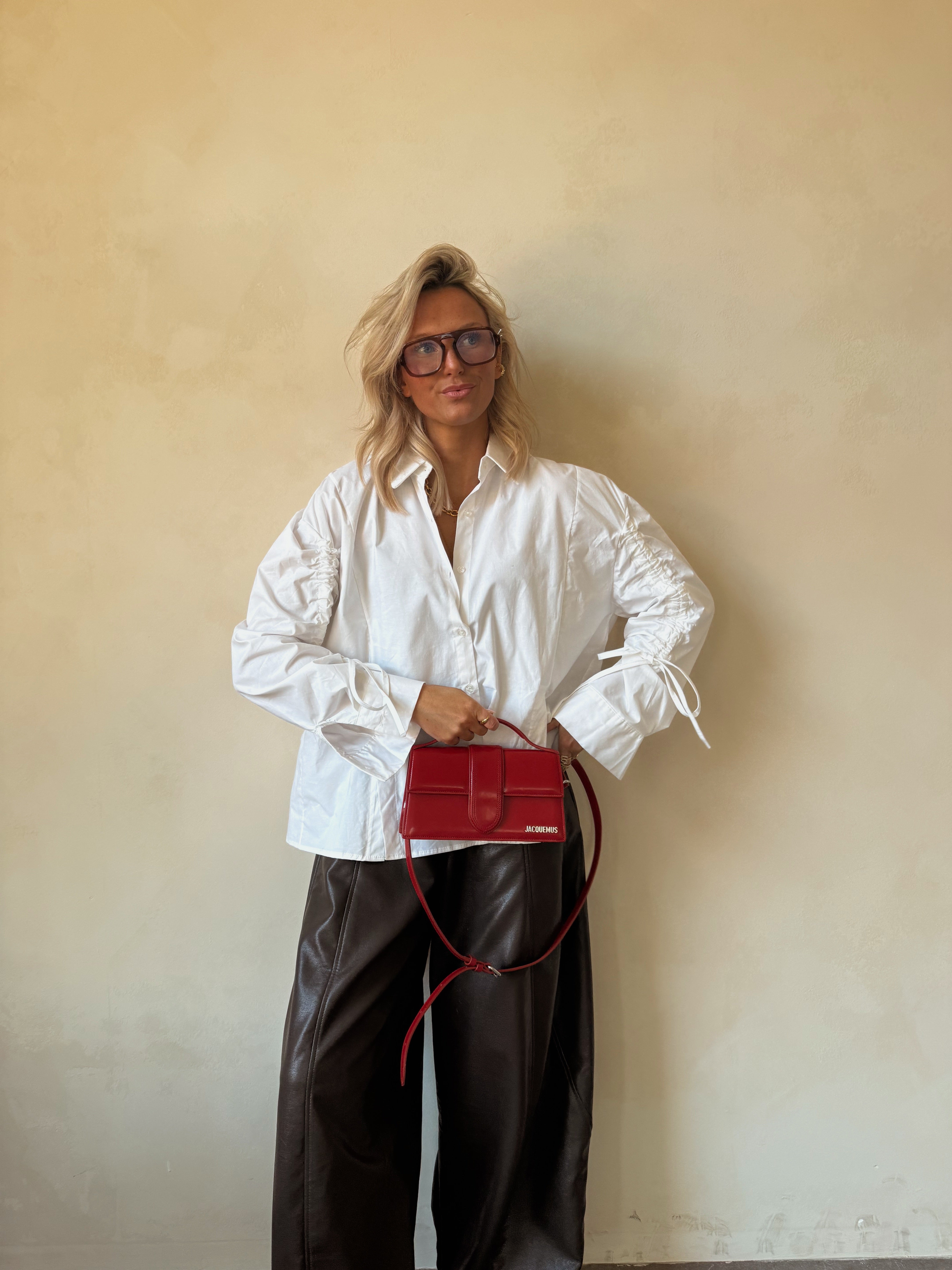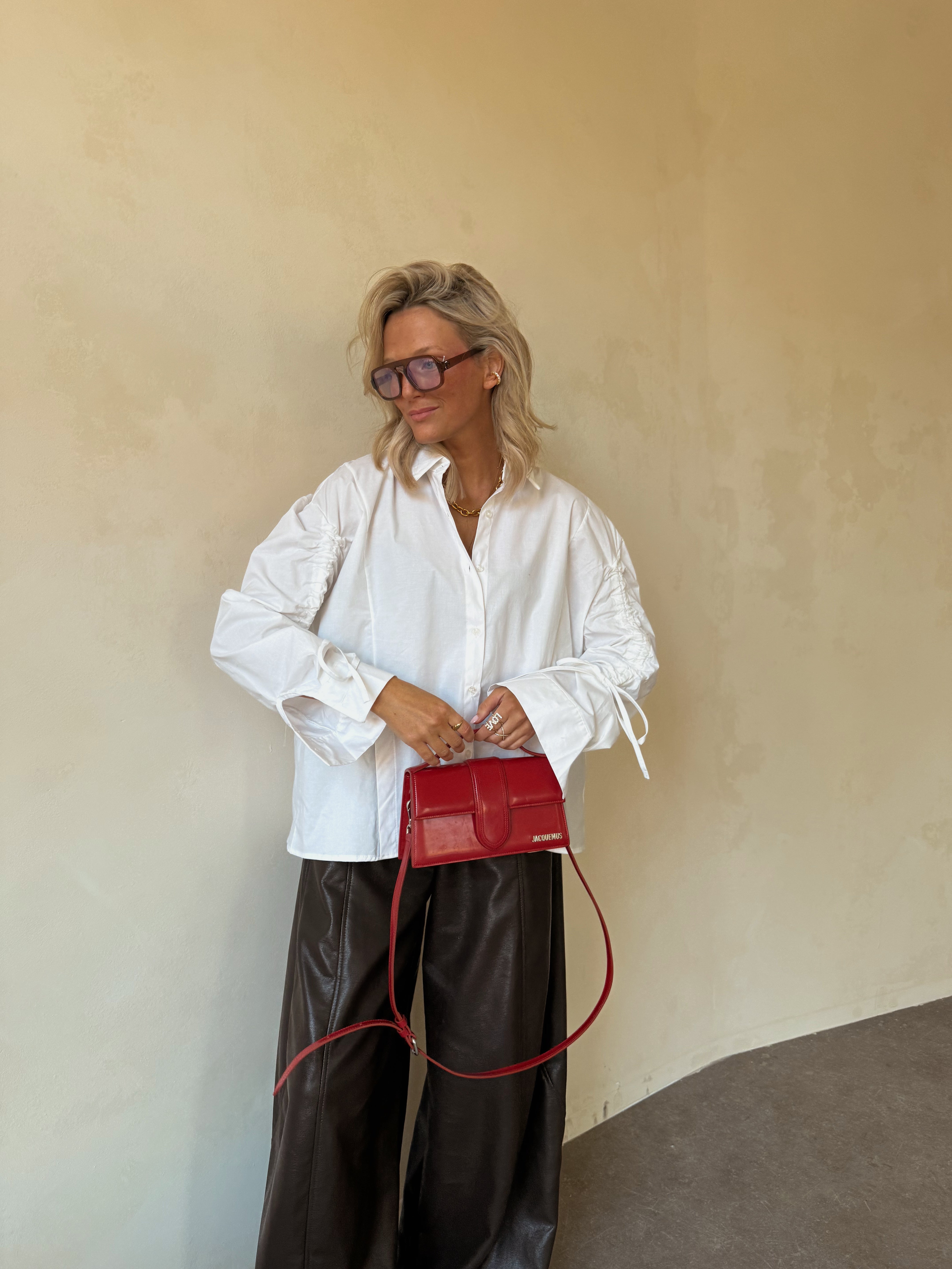 Een elegante en tijdloze witte blouse met een moderne twist. De klassieke kraag en knoopsluiting worden gecombineerd met opvallende ruches en strikdetails op de mouwen, wat zorgt voor een vrouwelijke en verfijnde uitstraling. Perfect voor zowel kantoorlooks als stijlvolle casual outfits.
