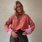 Deze zachte gebreide trui brengt kleur en comfort samen in één opvallend design. De rood-witte strepen geven een speelse en frisse uitstraling, terwijl de roze en pastelaccenten onderaan zorgen voor een unieke, trendy twist.