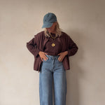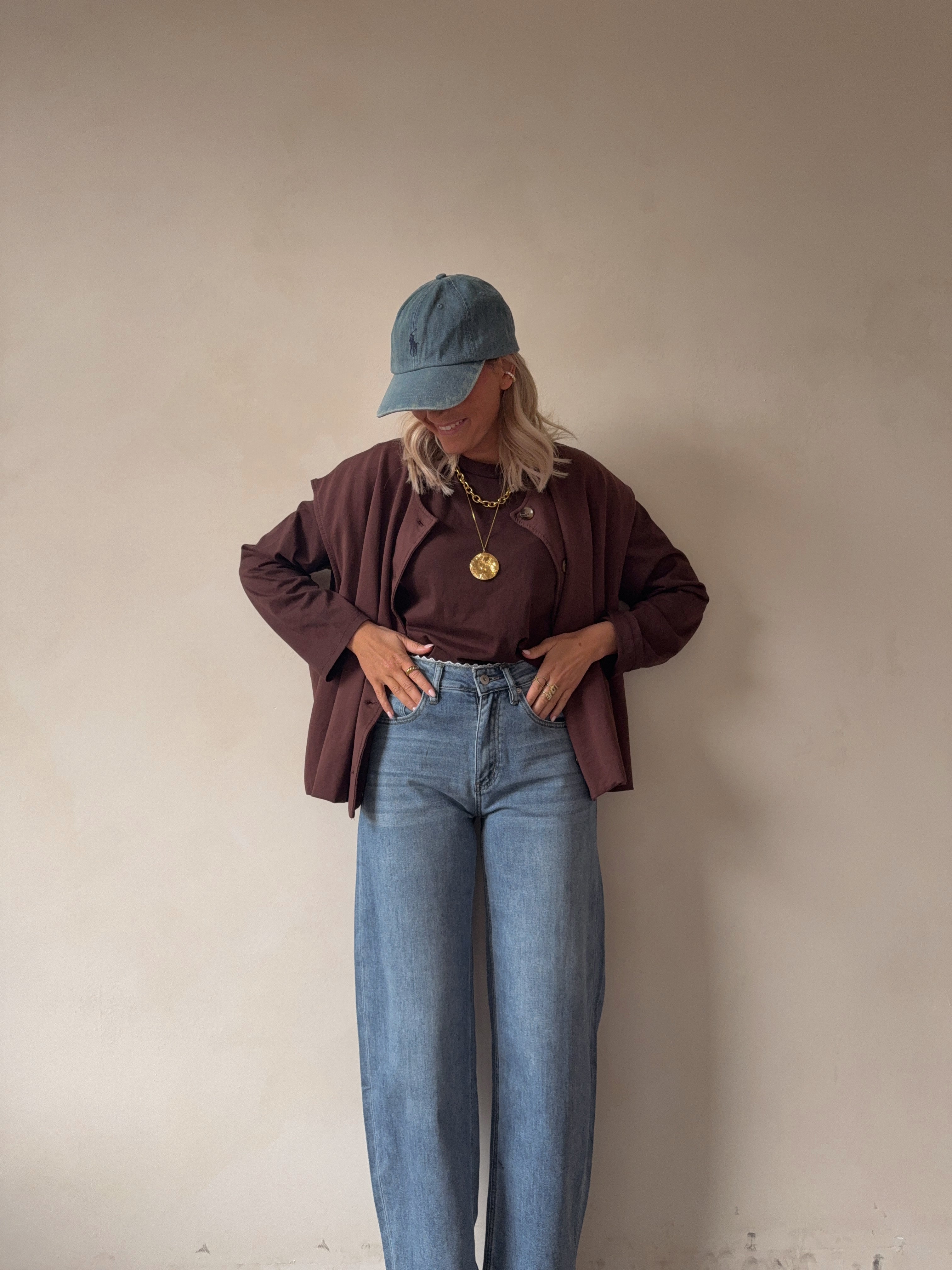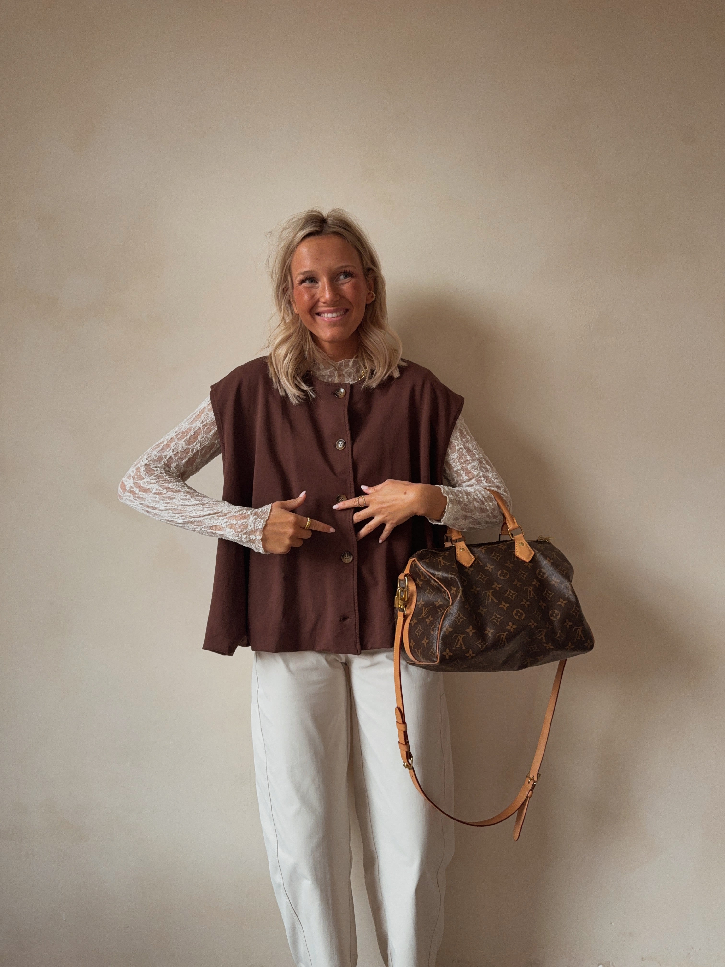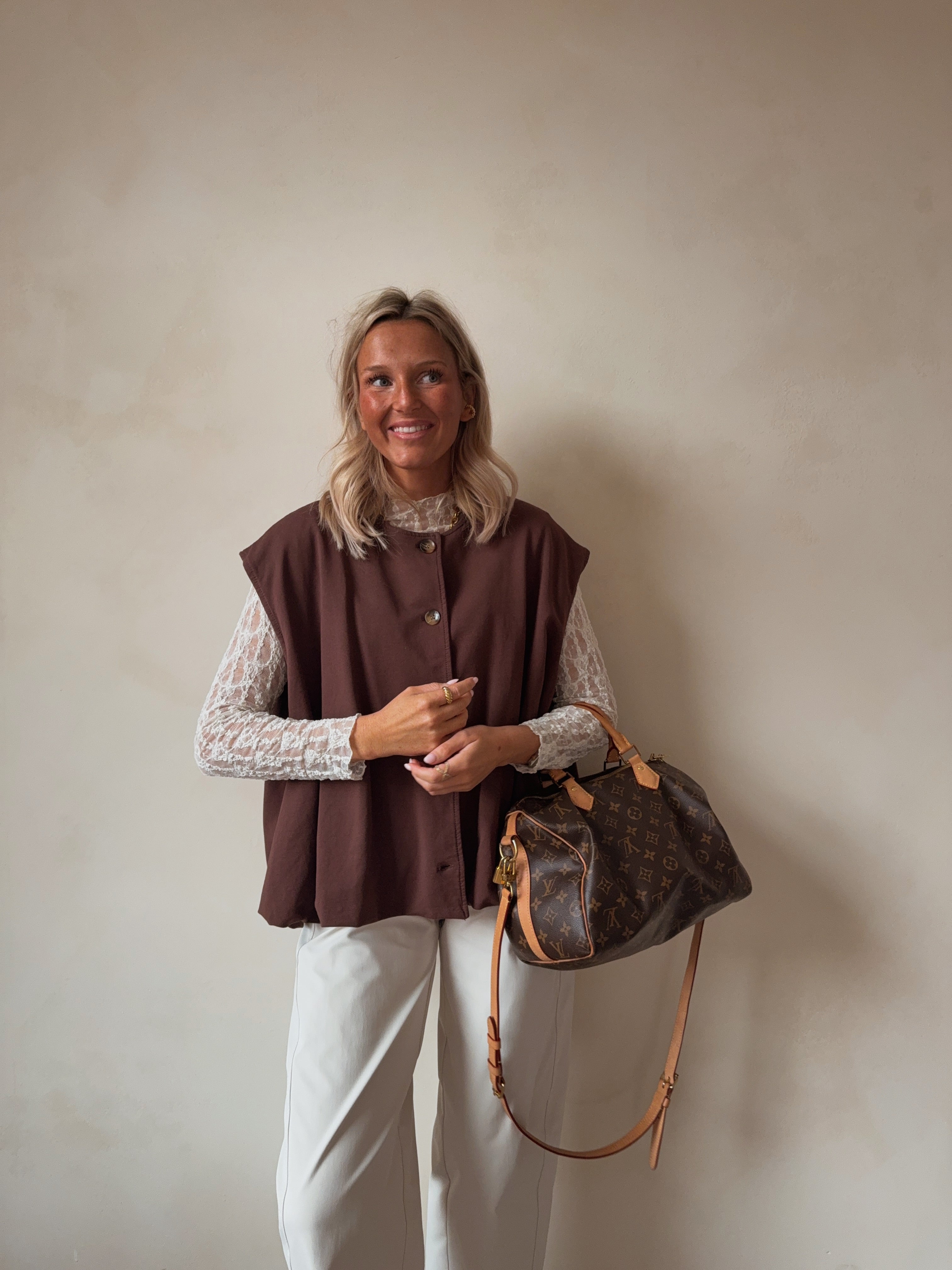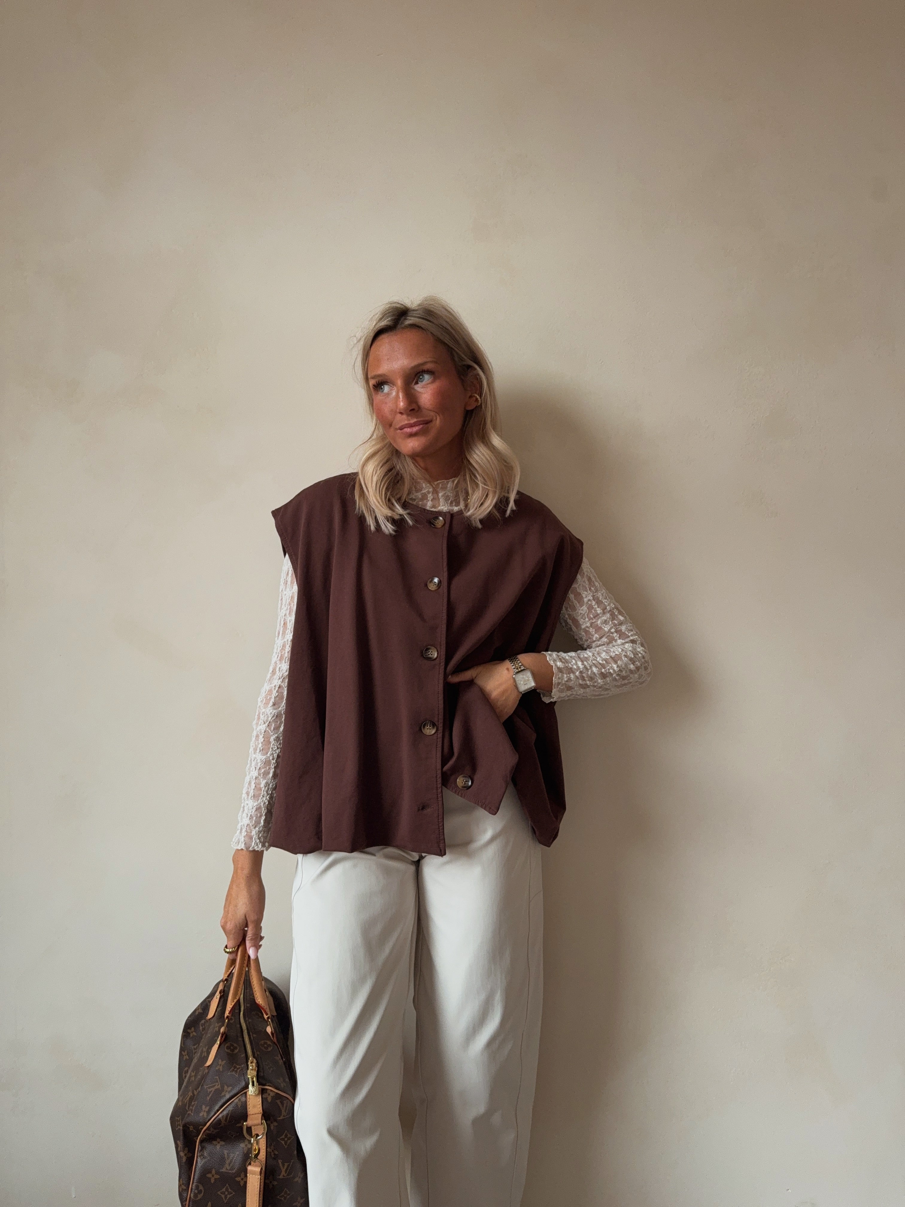 Stijlvolle mouwloze top in warme bruine tint met knoopsluiting vooraan. Minimalistisch, comfortabel en perfect voor een moderne, effortless look.