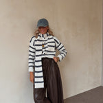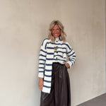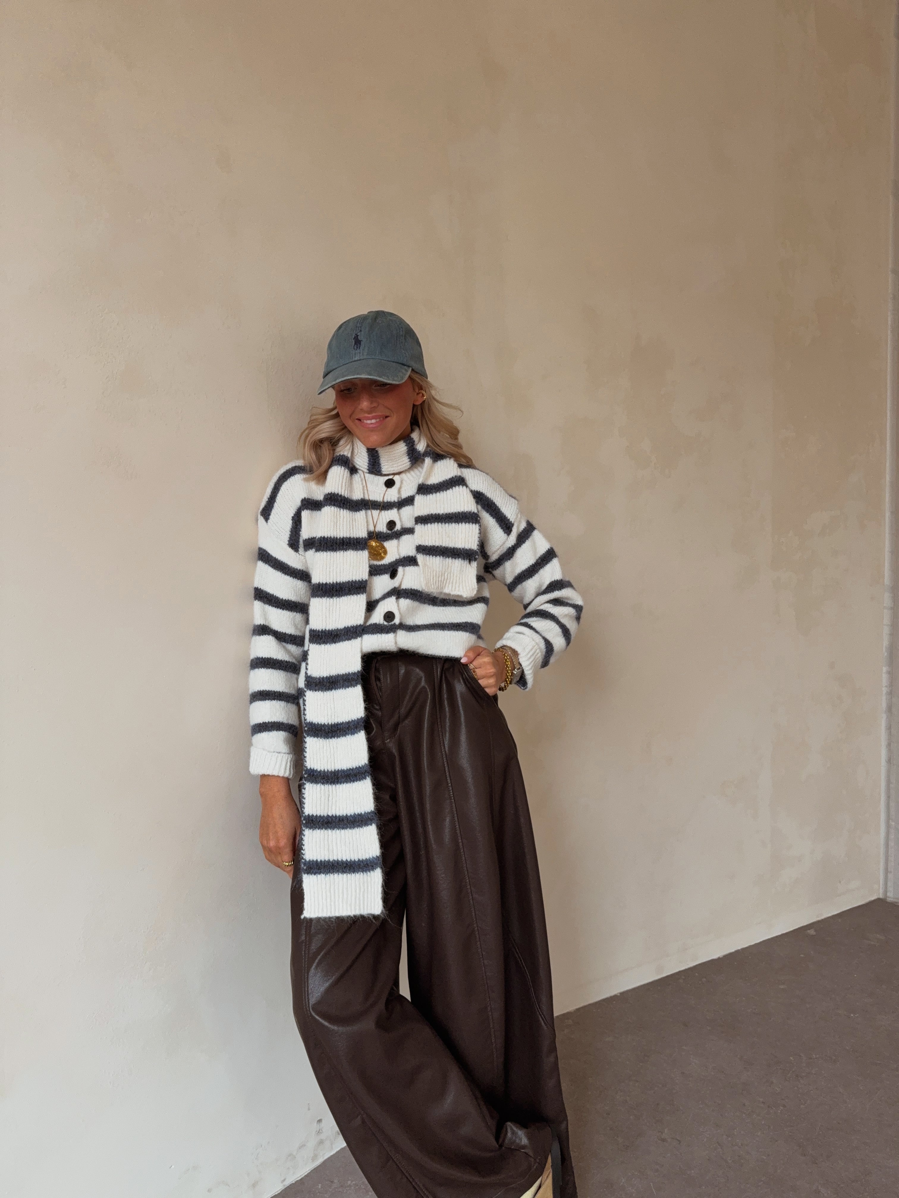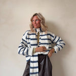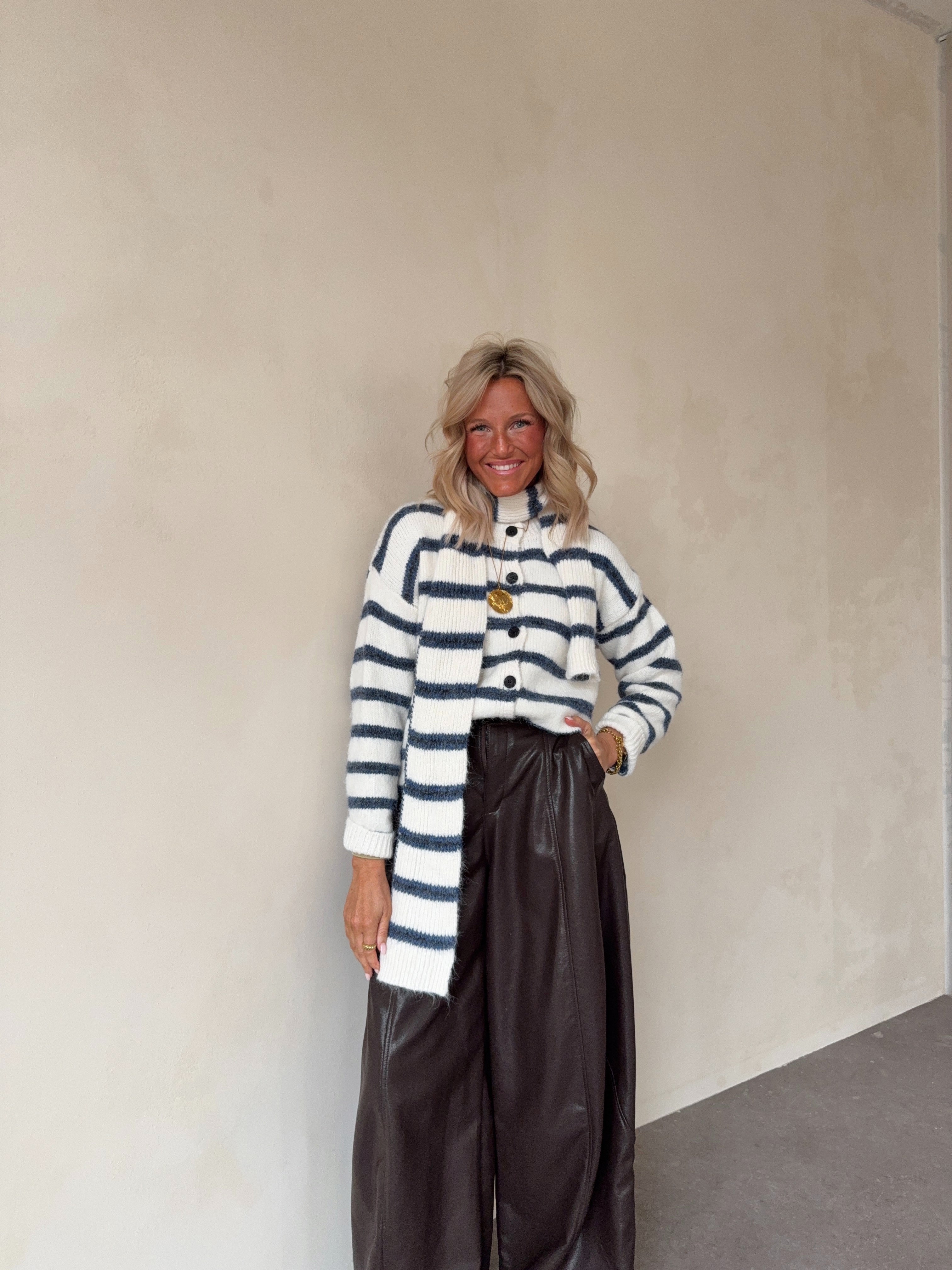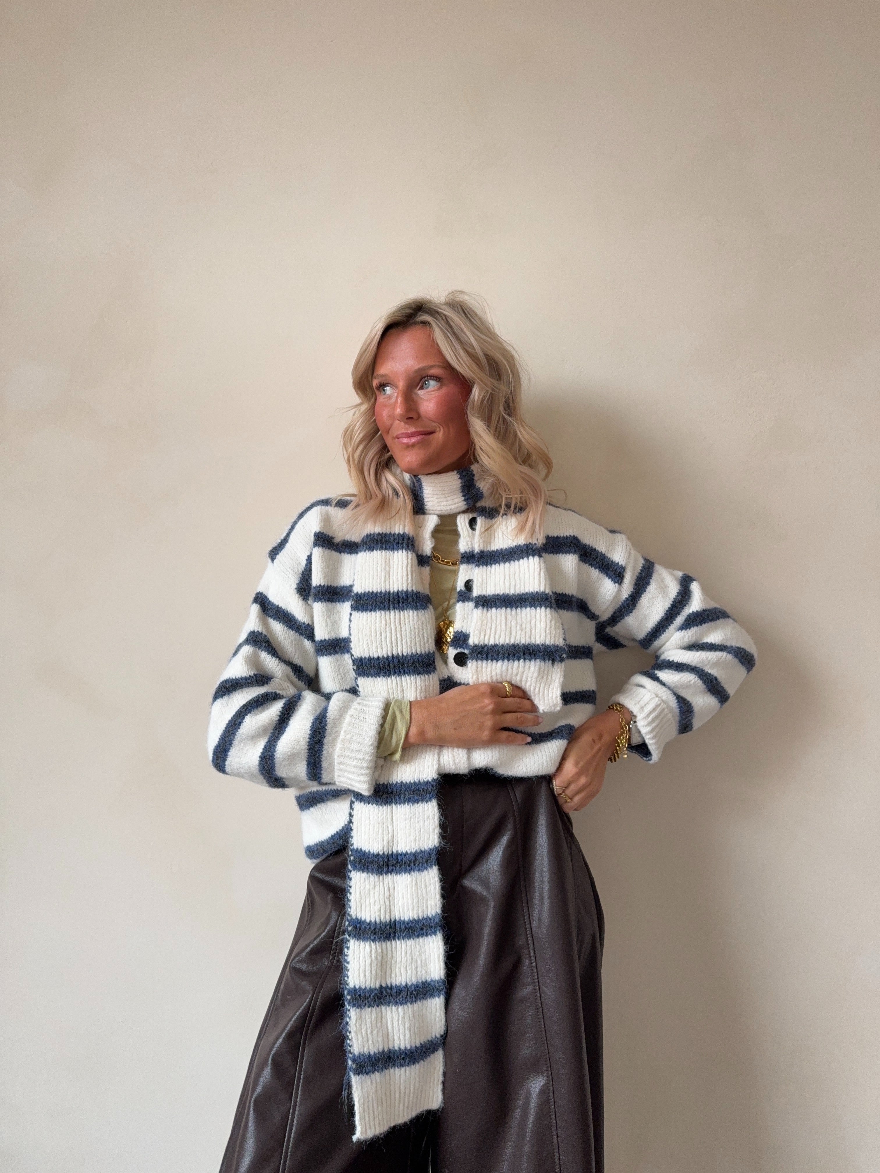 Zachte gebreide cardigan met navy strepen en bijpassende sjaal die er los bij hoort. Dit cozy en stijlvolle vest heeft een relaxte pasvorm en is perfect voor een warme, casual-chique look.