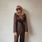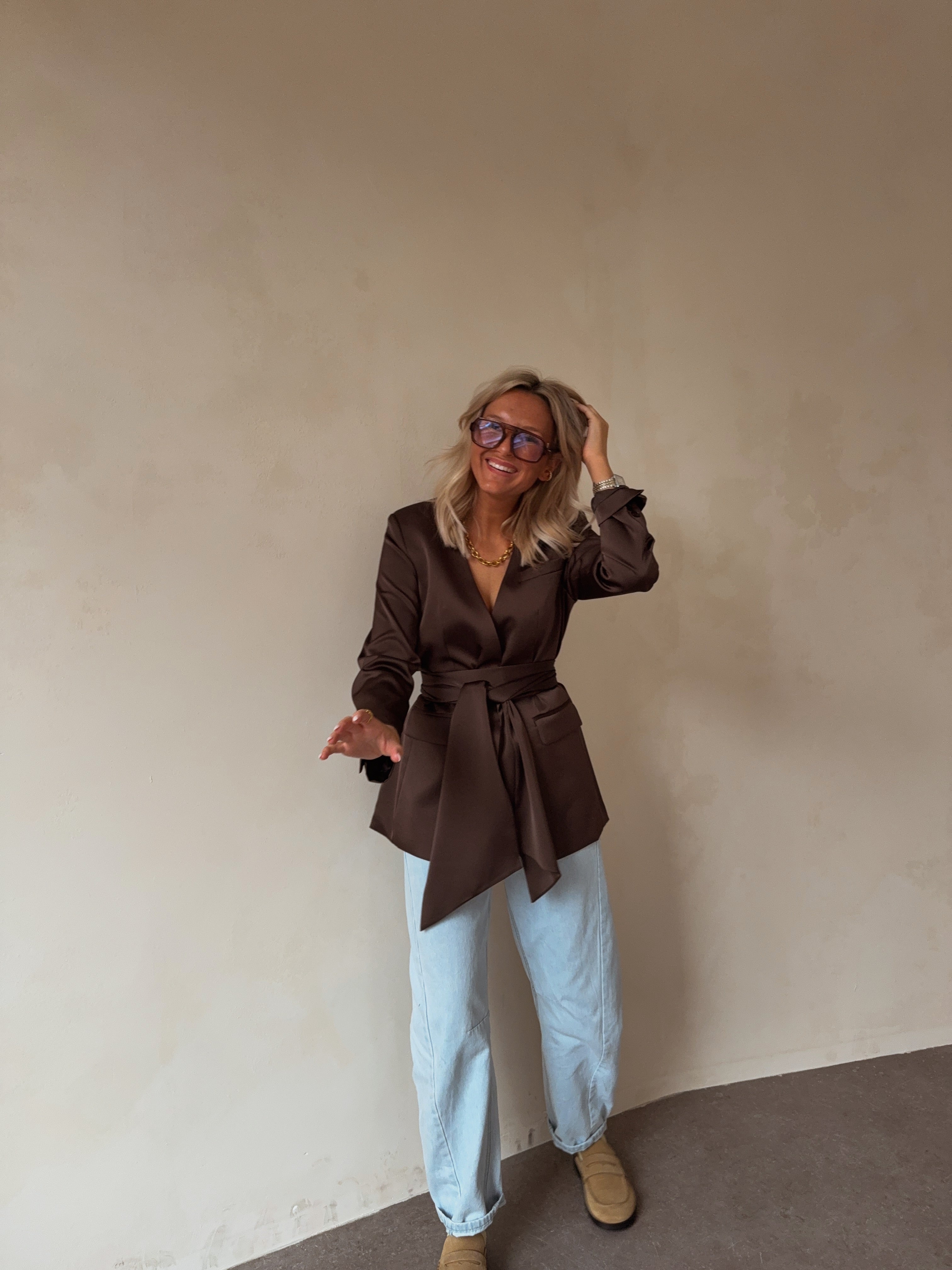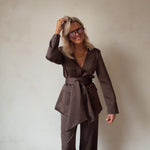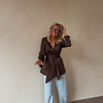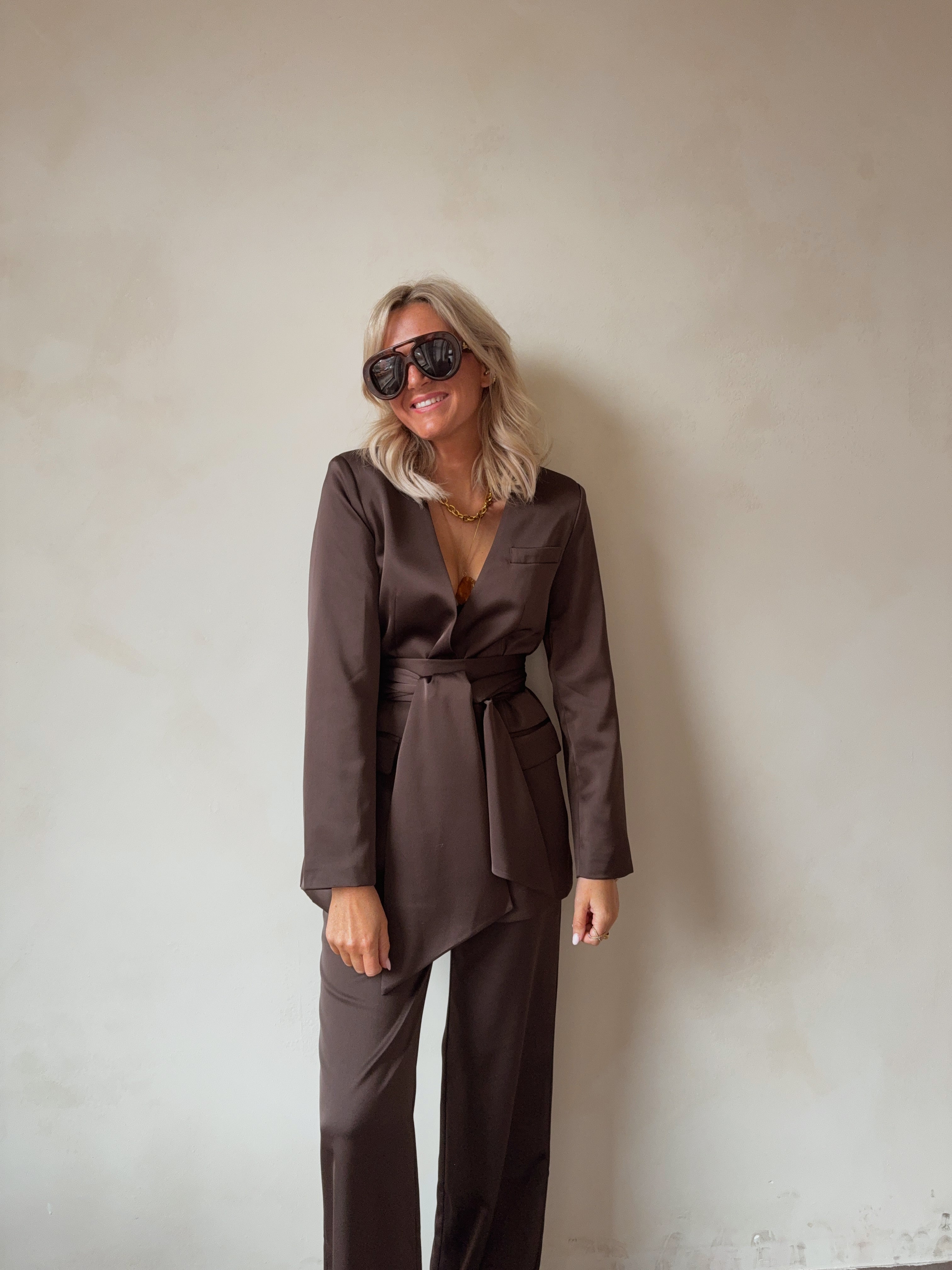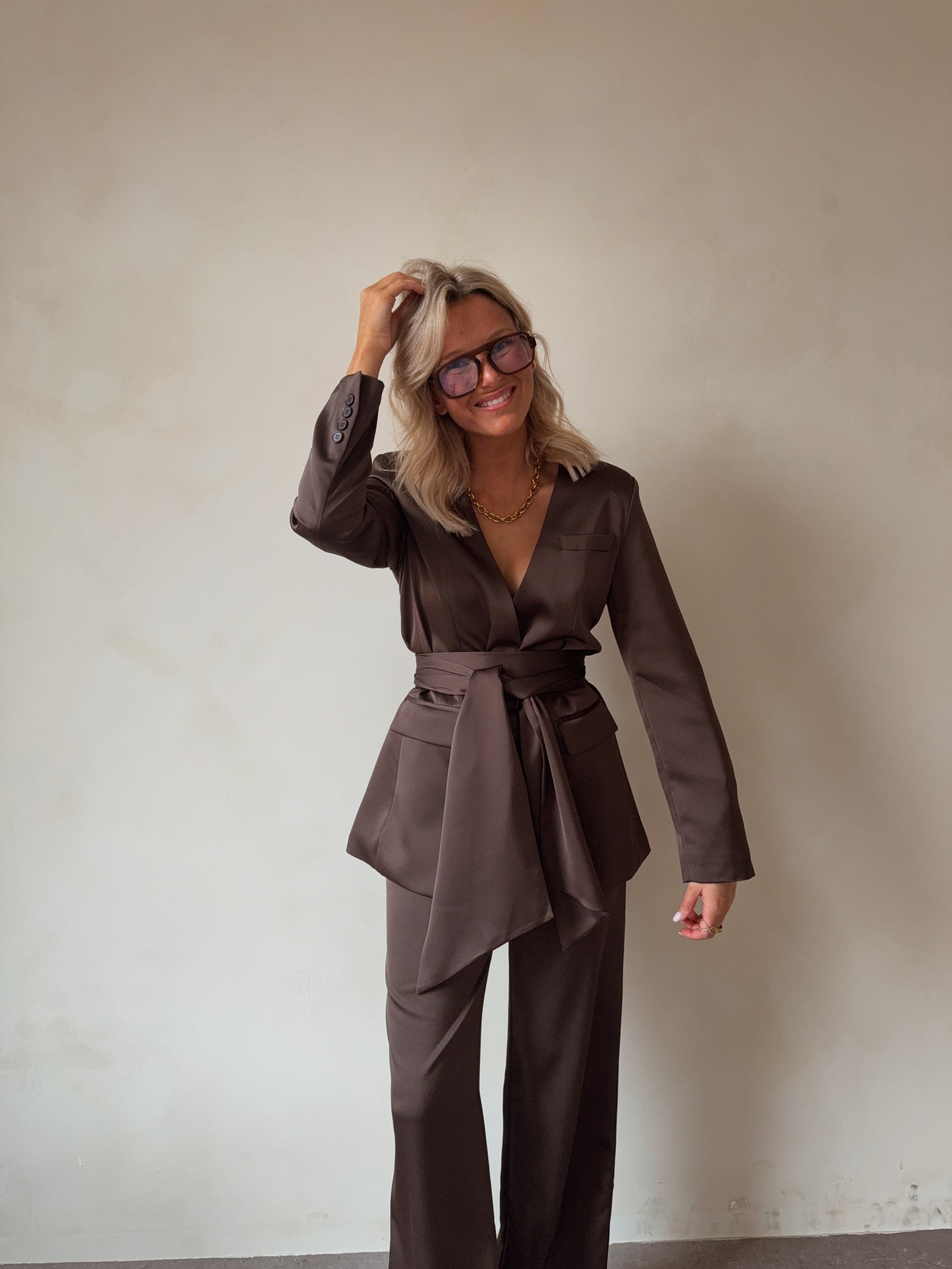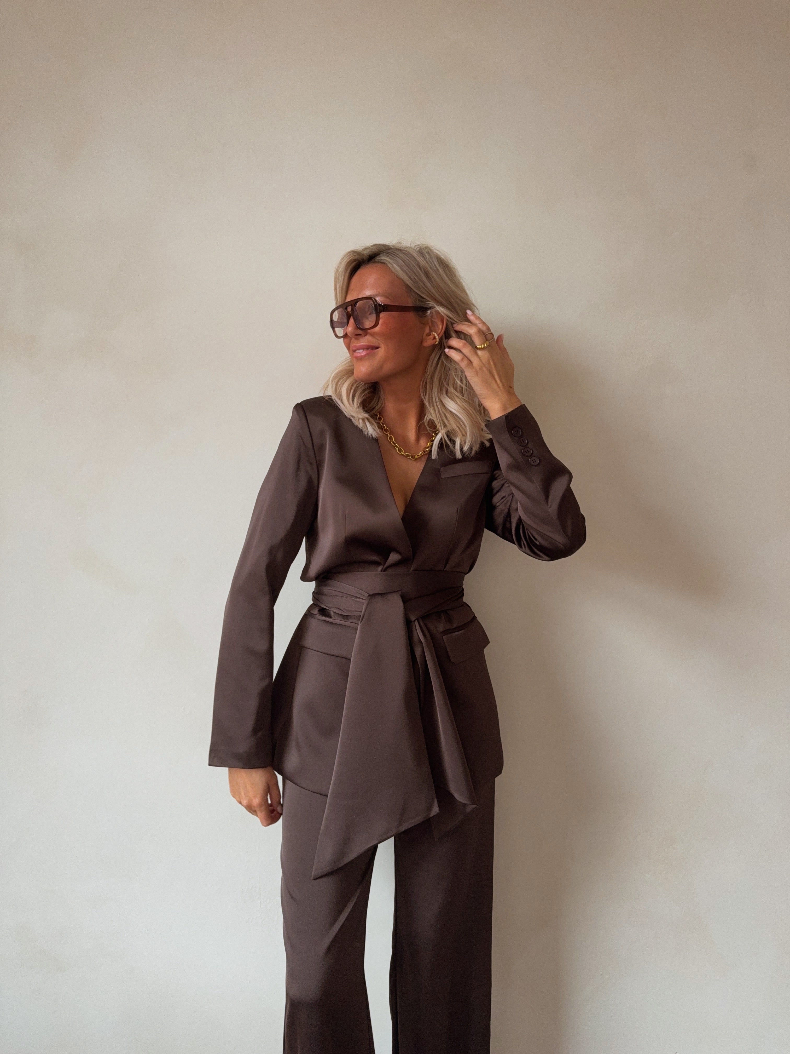 Stijlvolle blazer-jumpsuit met V-hals en tailleceintuur in een luxe chocoladebruine tint. Perfect voor een krachtige, elegante look